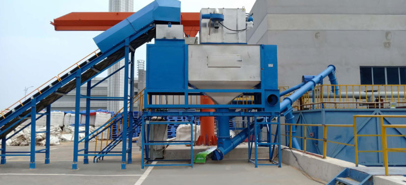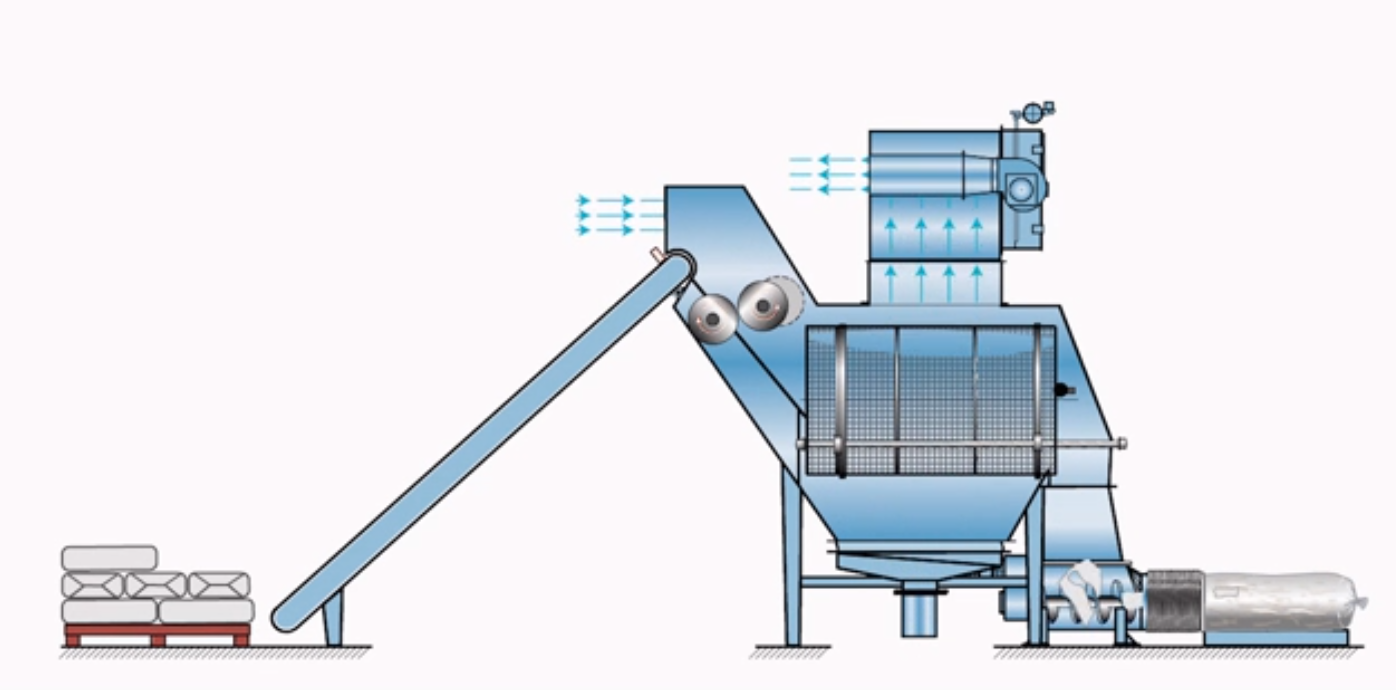 小袋自動拆包機(jī)由人工或機(jī)器人將包裝袋放到輸送機(jī)上,進(jìn)行輸送到指定位置,或進(jìn)入破碎機(jī)后自動拆包,物料自動分離落入下游設(shè)備。廢袋自動分離后自動壓縮,拆包的過程中產(chǎn)生的揚(yáng)塵由過濾除塵器凈化過濾達(dá)標(biāo)后排出。